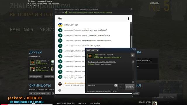 Время начало стримов,чаще вечером под ПИВКО =) Донатное голосовое сообщение ------- http://www.donationalerts.ru/r/zhalo Скачать ПЛЕЙЛИСТ v2 --------- https://yadi.sk/d/wcznALyn3H6cAs ПОЛЕЗНЫЕ ССЫЛКИ : Скачать SWEEt FX для Survarium -------- https://yadi.sk/d/NIj9dVlV3GchKY Скачать Light Launcher knyazev-tools для Survarium ------- https://surv.knyazev-tools.ru/light-launcher/ Проверка ПИНГА для PLAYERUNKNOWN'S BATTLEGROUNDS ------- http://pubg.disquse.ru/ Полная статистика PLAYERUNKNOWN'S BATTLEGROUNDS -------- https://pubg.me/ МОЯ СИСТЕМА : ГП GeForce GTX 670 2gb ЦП Intel(R) Core(TM) i5-3570K CPU @ 3.40GHz ОП 8,00 ГБ ОЗУ (7.95 ГБ доступно) ОС Microsoft Windows 7 Максимальная МОНИТОР viewsonic va1906wb 19" дюймов 75 Гц Простая мышь и клавиатура,без понтов =)