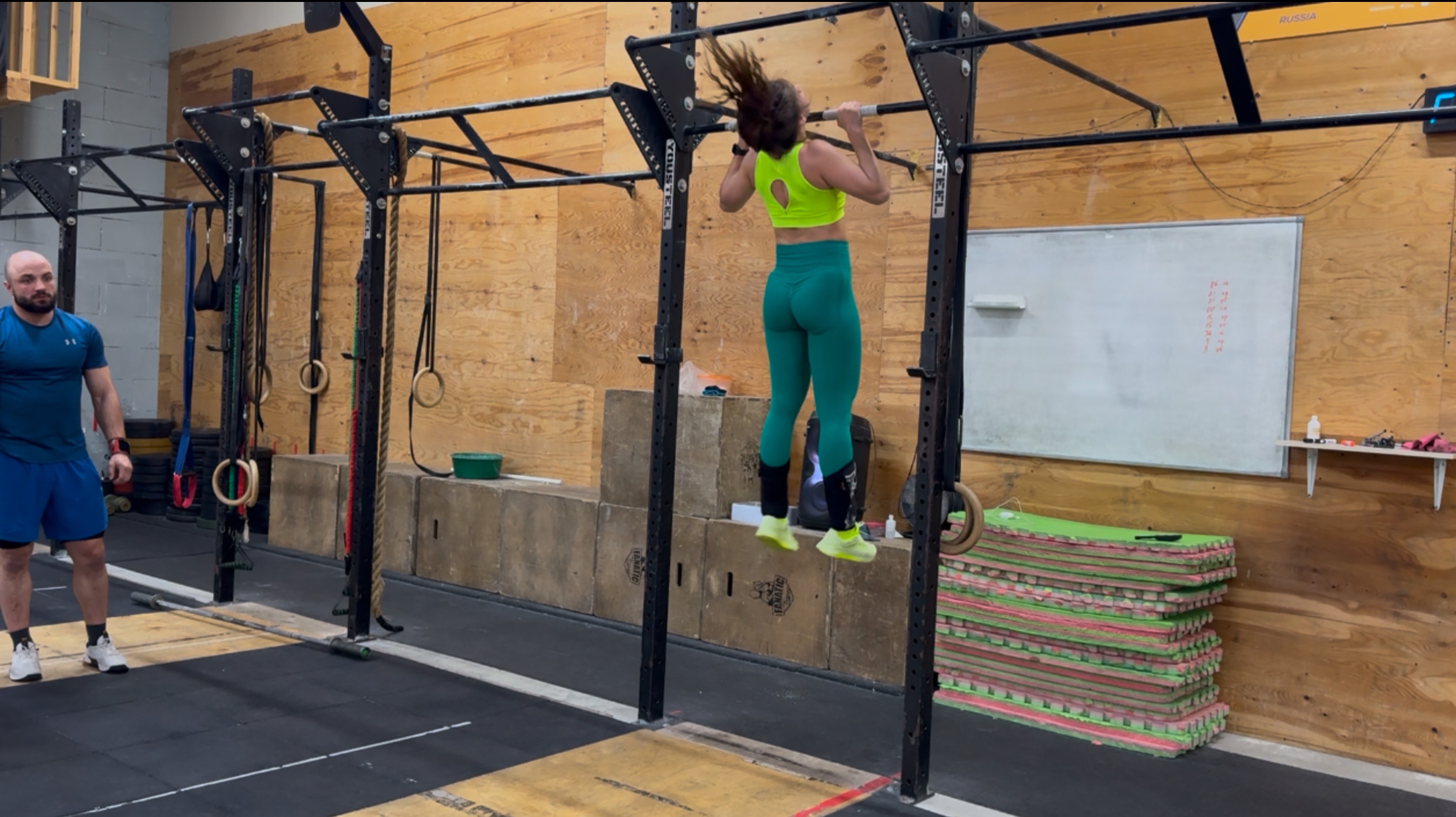 Задание 1 На время: 30 перепрыгиваний короба 60/50см с сшагиванием 3 раунда "DT" с штангой 40/30кг (12 становых тяг, 9 взятий с виса ВК в стойку, 6 подъемов с груди над головой) 30 перепрыгиваний короба 60/50см (ТАЙБРЕЙК) с сшагиванием 10 бурпи с подтягиванием Лимит 10мин.