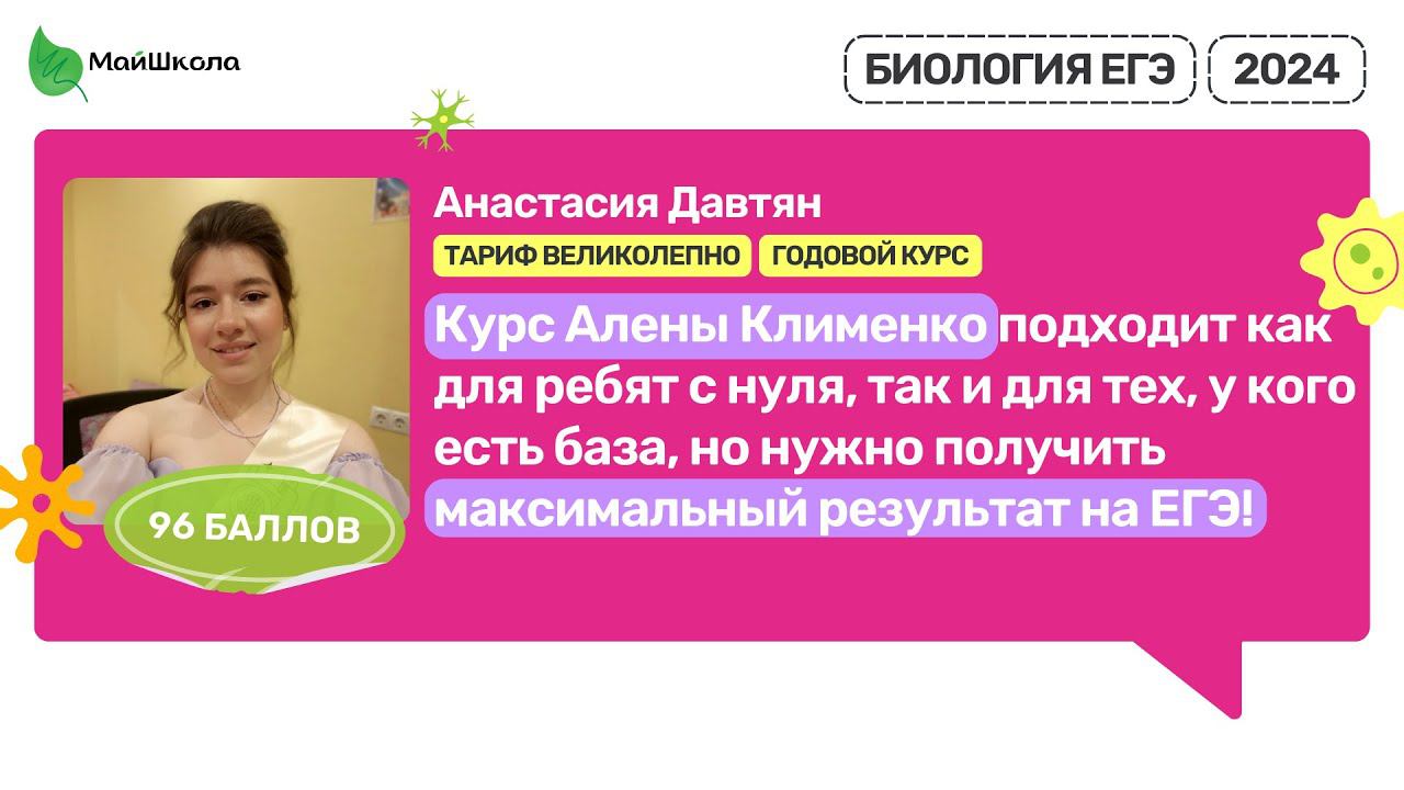 Анастасия Давтян 96 балла ЕГЭ 2024 | Майшкола #егэ #биология Записывайся на актуальные курсы подготовки к ЕГЭ по Биологии здесь: https://clck.ru/359pZ9 МайШкола это: - Опытные преподаватели, которые в совершенстве знают структуру ЕГЭ и каждый год сдают ЕГЭ по своему предмету, чтобы почувствовать себя на месте ученика - У нас авторская программа подготовки, показавшая свою эффективность на результатах ЕГЭ более 3000 учеников - 80 – средний балл учеников на ЕГЭ по Биологии Подписывайся на канал, чтобы не пропустить новые видео и эфиры! https://www.youtube.com/channel/UCq4KDNX4OsLFoOGQjePYWOA?sub_confirmation=1 ► Инстаграм Алены: https://www.instagram.com/alenabiology ► Телеграм-канал: https://t.me/alenabio ► Группа ВК: https://vk.com/public67153074