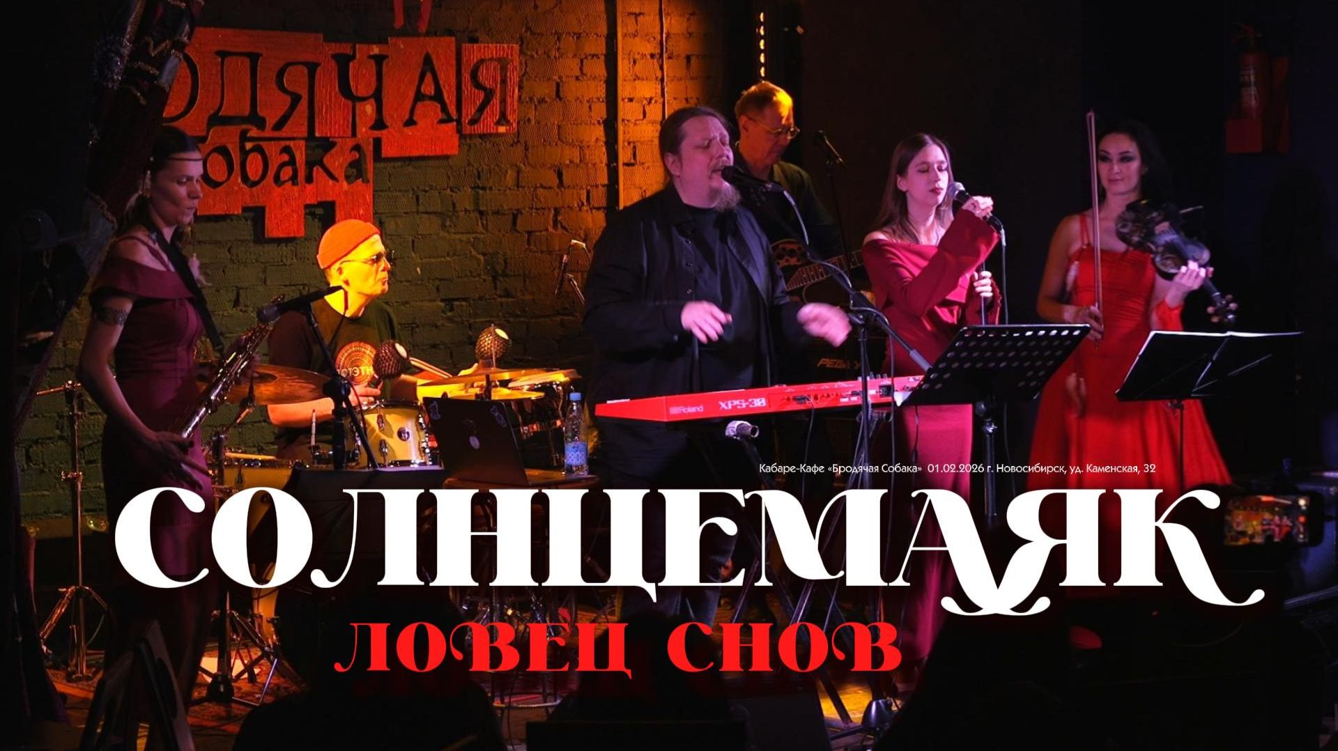 Группа СОЛНЦЕМАЯК в «Бродячей Собаке» 01.02.2026 с программой «Ловец Снов» Выступление открывается презентацией анимационного клипа на песню «Бирюзовая колыбельная», которая живописно дополняет трилогию алтайских песен и является совместным творческим дебютом с вокалисткой Дарьей Дочкиной. На сцене: Святослав Мелик – автор, клавиши, вокал Олег Чернышов – гитара, бас, вокал Илья Лугачёв – ударные Дарья Дочкина – вокал Галина Беляева – духовые Юлия Макарова – скрипка Запись живого альбома «Ловец снов» стала важной вехой в истории группы СолнцеМаяк. В программе прозвучали как очень ранние, так и совсем новые, не известные публике композиции. 01. Реальные люди 02. Птица 03. За горизонт 04. Верь 05. Наша лодка плывёт 06. Тамбовский волк 07. Я стихия 08. Бирюзовая колыбельная 09. Моё счастье ждёт меня 10. Ловец снов 11. Лесная ведьма 12. Молитва 13. Здорово жить 14. Голос Белой горы 15. Я там 16. Вечный костёр 17. Только пой 18. Моя любовь 19. Черти-лебеди 20. Душа бродяги 21. Последний билет 22. Лисица 23. Он бежит за ней 24. Мы – Север! 25. Рай на Земле Кабаре-кафе «Бродячая Собака» Новосибирск, ул. Каменская, 32 1 февраля 2026 г.