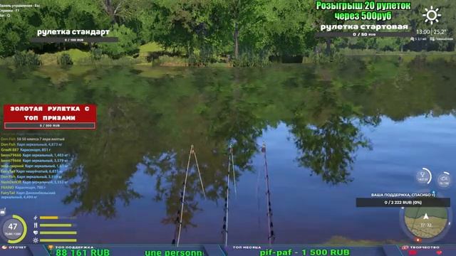 Поддержка донатом https://new.donatepay.ru/@1032463 Альтернативный донат https://www.donationalerts.com/r/kalyamba11 5536913964533059 карта Тинькоф Если стрим лагает,смотри стрим на трово https://trovo.live/s/Kalyamba_na_Ribalke Мой ВК - https://vk.com/kalyantv НИК в игре kalyan11 НАШ ДИСКОРД СЕРВЕР https://discord.gg/4ZzSQkQtsK Заказ водоема на 1 час - 500р ( весь стрим 2500р ) Модерка на канале 1200р ( каждая следующая на 100р больше) Озвучка доната на 40р,50р,100р,200р,300р,500р,1000р ✅Призы в рулетке "ЗОЛОТАЯ" ✔ ЗОЛОТО ✔ ПРЕМ ✔ КАТУШКИ РАПТОР 40, АЗИМУТ 10000, СИЛЬВЕР 80, ТАЙГА с 30 ✔ ПАЛКИ ПИЛКЕРНАЯ, ДОНКА МОРСКИЕ, ✔ РОД ПОД, СТУЛЬЯ ✅Призы в рулетке СТАНДАРТ : ✔ катушка "РАПТОР 40" ✔ катушка "АЗИМУТ 10000" ✔ катушка "ТАЙГА С30, С40," ✔ катушки 60 для медного ( ЭВИИ, НАТОРЫ, ГОЛДА, и тд) ✔ ПИЛКЕРНОЕ УДИЛИЩЕ КОРОЛЕВА ОКЕАНА ✔ Морское Донное удилище ✔ прем ( 3, 7, 30 дней) ✔ золото ( 1, 3, 5, 10, 20 ,50) ✔ билет на море ( 1, 3, 5 дней) ✔ голд наживка и др. ✅Призы в рулетке "СТАРТОВАЯ" ✔ катушка "silver80" ✔ катушка "БЕЛЫЙ КАЛИБР" ✔ катушка "Черный калибр" ✔ катушка "Протон" ✔ катушка "Нарга 6000" ✔ Набор Фидерист и спинингист ✔ Карповик Фортуна ✔ фидерные удилища ✔ прем, золото, алкашка, наживки и тд P.s Рулетка это не казино, а награда за поддержку стримера. Вечный ТОП ПОДДЕРЖКИ (11.05.2024) 1. Dimon_pokemonchik 119 784 2. Interceptor 75 508 3. Skreb79 71 261 4. une personne 68 619 5. Нарвал77 31 550
