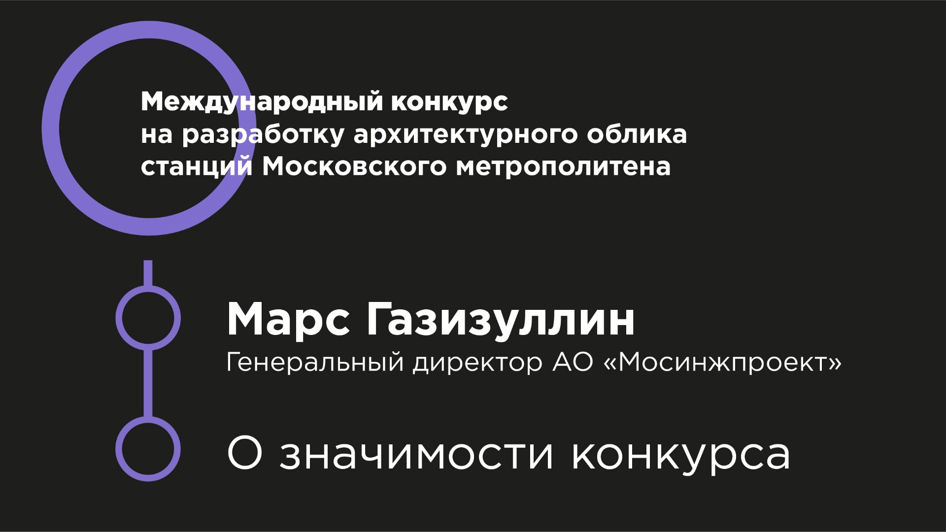 Видеообращение Марса Газизуллина, генерального директора АО «Мосинжпроект», в рамках старта Открытого международного конкурса на разработку архитектурно-художественного облика станций двух новых веток Московского метрополитена — «Проспект Маршала Жукова» Рублёво-Архангельской линии и станции с рабочим названием «Кленовый бульвар 2» Бирюлёвской линии.
