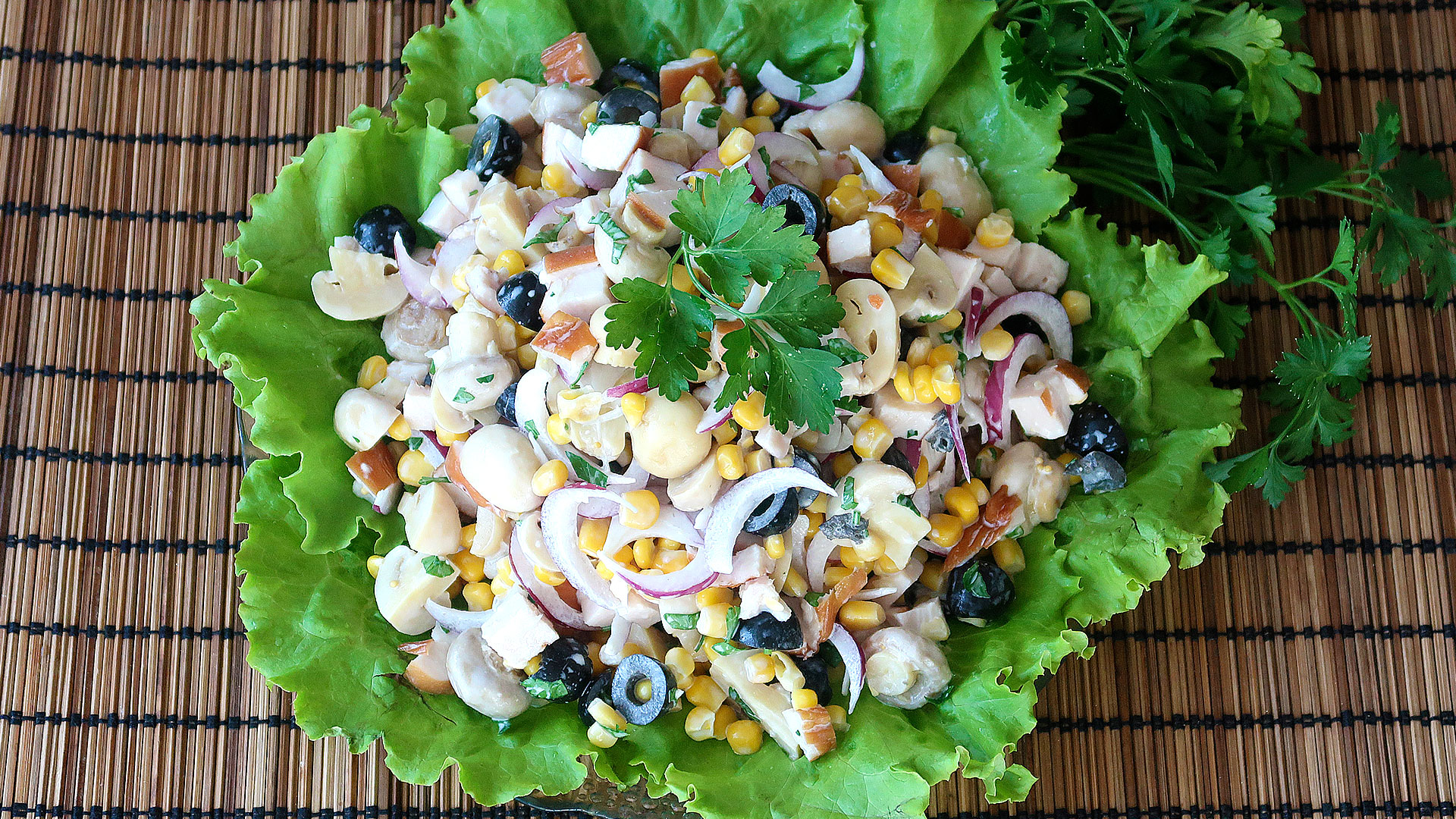 Сегодня приготовим яркий, вкусный салат с копченым куриным филе. Для этого салата ничего не придется отваривать, готовится он быстро, а съедается еще быстрей. Копченое куриное филе — 200 г Маслины без косточки — 1 б Консервированная кукуруза — 1 б Шампиньоны маринованные — 200 г Лук красный салатный — 1\2 Зелень Майонез — 2-3 ст.л