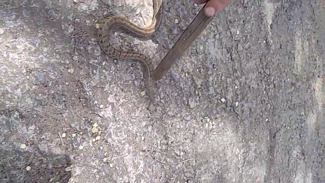 Узорчатый полоз. Трещит хвостом. Глаз бусинкой. Не ядовит. Хороший пример, на котором видно, что змея не имеет никакого желания сражаться с вами и пытается уползти, но если её тревожить, то атакует...