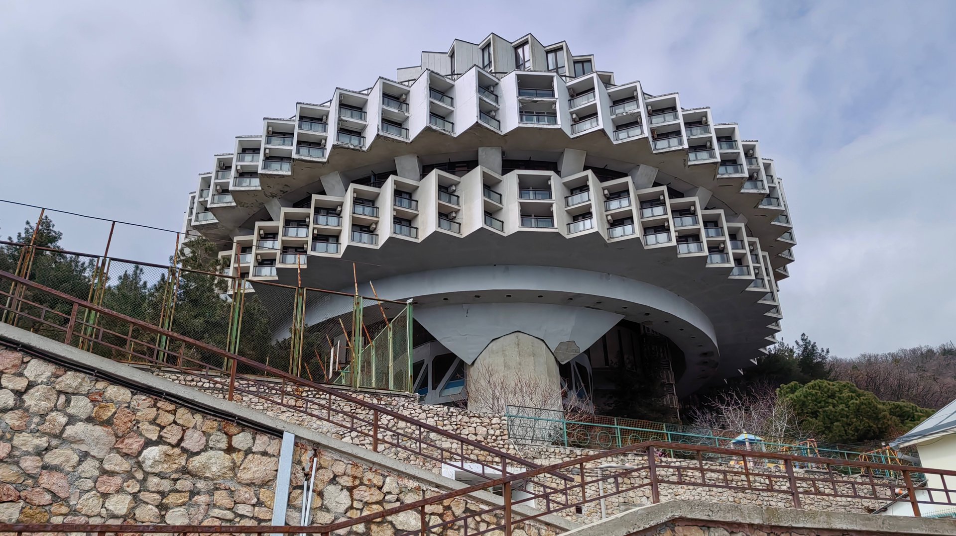 Пгт. Курпаты - небольшой поселок в 8,5 км от г. Ялты, сформированый, главным образом, курортными объектами. Во время прогулки мы осмотрели санаторий "Курпаты", оба корпуса : легендарную "летающую тарелку" - корпус "Дружба" со скульптурной группой "Братание" перед главным входом и корпус "Пальмиро Тольятти". Вдохнули полной грудью морского воздуха на знаменитом "Золотом пляже" и осмотрели остатки лечебного корпуса канувшего в лету санатория "Золотой пляж". Прошлись по парку на территории корпуса "Пальмиро Тольятти", заглянули в заброшенку - бывшую столовую-библиотеку, оценили отличное состояние бюста Пальмиро Тольятти и статуи "Девушка с книгой". А Нептун, украшающий фонтан рядом с корпусом "Пальмиро Тольятти", не порадовал (морского царя злодейски лишили короны). А еще мы прошли мимо закрытого для свободного посещения санатория и парка "Горный" и из-за забора высмотрели кусок территории отеля "Пальмира Палас". На этом территория пгт. Курпаты закончилась.