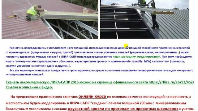 Ссылка на сайт курса https://makeev.justclick.ru/14novformat Скачать некоммерческую версию ЛИРА-САПР 2016 можно на странице официального сайта Лира сервис https://rflira.ru/kb/93/452/. ЛИРА-САПР. Расчет несущей способности 'сэндвич'-панелей. Кровля по прогонам из прокатного швеллера с учетом совместной работы конструкций. Встречайте новый формат онлайн занятий университета: только практика расчетов реальных объектов и конструкций вручную и в ЛИРА-САПР. ЗАНЯТИЯ БУДУТ ПРОВОДИТЬСЯ В СЕРВИСЕ МИРАПОЛИС С ВОЗМОЖНОСТЬЮ ДВУСТОРОННЕГО АУДИО И ВИДЕО ОБЩЕНИЯ СО СЛУШАТЕЛЯМИ (можно задавать аудио вопросы в прямом эфире, позаботьтесь, пожалуйста, о наличии микрофона...). Ссылка на сайт онлайн университета проф. Макеева С.А. https://sopromex.ru/. Оформить подписку на все мои бесплатные видео материалы по основам расчетов конструкций на прочность и жесткость (более 30 ГБ информации) можно на странице https://makeev.justclick.ru/podpiska_2020 или на главной сайта онлайн университета https://sopromex.ru/. Все продукты проф. Макеева С.А. по основам расчетов конструкций на прочность и жесткость https://shop.sopromex.ru/ или на сайте онлайн университета https://sopromex.ru/. Теги: сопромат,эпюры