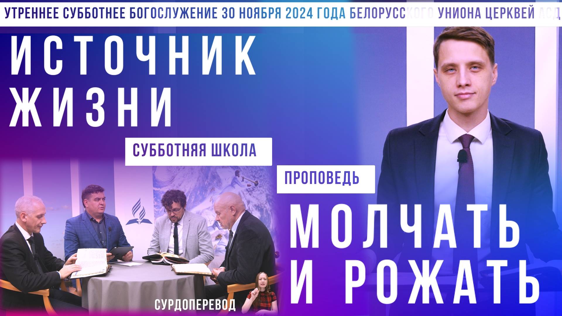 Уроки "Так говорит Библия" помогут вам самостоятельно познакомиться с тем, чему учит самая популярная книга в мире. Вы узнаете, что Слово Божье говорит о прошлом, настоящем и ближайшем будущем, найдете ответы на такие вопросы, как: Откуда взялось зло? Что ожидает человечество в будущем? Зачем молиться? Что Библия говорит о Вашем здоровье? Живы ли мертвые? Где находится ад? Когда наступит Судный день? Пройдите по ссылке и заполните урок. Это не займет у вас более 20 минут. Выполненные задания будут проверены квалифицированным преподавателем, с которым вы сможете обсудить возникающие вопросы. Ссылку на следующий урок вы получите на VIBER после выполнения первого урока https://biblestudy.by/lesson?GMFGUTPIADLGFU Подписывайтесь на наш канал! Не забудьте нажать колокольчик, чтобы не пропускать новые видео. Номер для ваших звонков и сообщений Viber, Whatsapp, Telegram +375 33 677 1 677 Мы будем признательны вам за репосты данного видео, а также лайки и комментарии. Это позволяет помочь тому, чтобы его увидело еще больше людей. Присоединяйтесь в 20:00 к разборам уроков субботней школы https://www.youtube.com/playlist?list=PLg_gRFjM68thKVEse4uQZTizZBLuIGVKO #народсвятой #веравБога #сГосподом #поклонение #благодать #служение #молитва #истина #духовноеразвитие #берегисебя #ввере #воимяИисуса #аминь 00:00:00 Intro 00:00:00 Пение "К счастью", Алеся Деревянко 00:03:22 Субботняя школа, урок № 9 "Источник жизни"; сурдоперевод Елена Морозова 00:49:58 Десятины и обещания 00:52:22 Пение "Без Христа не мыслю жизни я" 00:54:57 Проповедь "Молчать и рожать", Алексей Позняк, пастор г. Новополоцк, сурдоперевод Елена Морозова 01:22:01 Молитва 01:23:12 Пение "Служанка", Диана Юргель 01:27:07 Тихая молитва 01:27:39 Слова Благословения