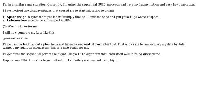 Databases: Sequential GUID or bigint for 'huge' database table PK Helpful? Please support me on Patreon: https://www.patreon.com/roelvandepaar With thanks & praise to God, and with thanks to the many people who have made this project possible! | Content (except music & images) licensed under CC BY-SA https://meta.stackexchange.com/help/licensing | Music: https://www.bensound.com/licensing | Images: https://stocksnap.io/license & others | With thanks to user usr (dba.stackexchange.com/users/6819), user Serg (dba.stackexchange.com/users/15549), user marc_s (dba.stackexchange.com/users/807), user Cade Roux (dba.stackexchange.com/users/321), user Barguast (dba.stackexchange.com/users/16664), and the Stack Exchange Network (dba.stackexchange.com/questions/31137). Trademarks are property of their respective owners. Disclaimer: All information is provided "AS IS" without warranty of any kind. You are responsible for your own actions. Please contact me if anything is amiss at Roel D.OT VandePaar A.T gmail.com