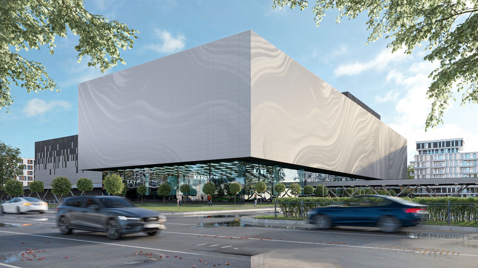 Видеовизуализация торгового центра с фасадом, выполненным из кассет с уникальным типом художественной перфорации нового поколения EMOCIO.