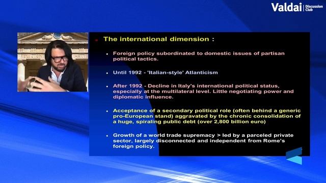 On October 5, the Valdai Club hosted an expert discussion, titled “Rightist Italy: What Should Russia and the World Expect from the New Government?” The recent parliamentary elections in Italy have led to the victory of a centre-right coalition. Dissatisfaction had grown among the voters of the country with the actions of the previous government, both in the fight against Covid and amid the current economic situation. Among the right-wing coalition, the largest number of votes was obtained by the Brothers of Italy party, which had previously always been on the sidelines and had only a small number of seats in parliament. Its leader Giorgia Meloni, in fact, turned out to be almost the only major politician in the election campaign who had not previously been in the highest positions of power. Purely formally, the Brothers of Italy are historically associated with the Italian Social Movement — a structure that, after the Second World War, united former supporters of Benito Mussolini. Although it is now quite clear that the Brothers of Italy have no links with the ideologies of the past, the world media declared that “fascists have returned to power” in Italy. This may explain the extremely harsh statement of European Commission President Ursula von der Leyen before the vote that the citizens of Italy must make the right choice, and that otherwise the EU will have the means to respond. A separate issue under discussion is what Italy’s position would be towards Russia. Giorgia Meloni has already made her support for Ukraine clear. At the same time, the coalition includes Silvio Berlusconi and Matteo Salvini, who have a well-established reputation as “friends of Putin” in the EU. However, one should hardly expect that Italy will abandon sanctions against Russia. Will the right-wing forces satisfy the demands of the Italian voters? Will the new government be able to overcome the economic consequences of the pandemic? Will it be able to put an end to the internal political crisis in Italy? How will relations between Russia and Italy change under Meloni’s government? How real is the potential for Italy, under the new government, to take a more active position in mediating and trying to resolve the Ukrainian conflict? All these questions were discussed by the participants in the Valdai Club discussion. Speakers: Elena Maslova, Senior Research Fellow, Institute of Europe, Russian Academy of Sciences Igor Pelicciari, Professor at the University of Urbino (UNIURB) Vittorio Torrembini, Honorary Consul of Italy in Lipetsk, Chairman of the Board of Directors of the Association of Italian Entrepreneurs in Russia GIM UNIMPRESA Moderator: Oleg Barabanov, Programme Director, Valdai Discussion Club.