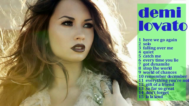 Demi Lovato Best Songs Greatest Hits Tops Songs 2014 Here We Go Again, Solo, Falling Over Me, Quiet, Catch Me, Every Time You Lie , Got Dynamite, Stop The World , World Of Chances , Remember December, Everything You're Not, Gift Of A Friend, So Far So Great, Don't Forget, La La Land,