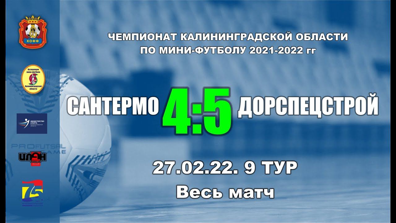 27.02.22. Чемпионат Калининградской области по мини-футболу. Суперлига. 9-й тур. «СанТермо» - «Дорспецстрой» 4:5 (2:2). Весь матч. Голы забили: Е.Афонин (8'), Д.Исупов (10'), Д.Сасковец (37'), А.Можаровский (40') -- А.Малашенко (12', 39'), С.Киселев (19', 38'), Е.Смыков (29') Предупреждены: А.Жарников (С), А.Сульдин (С), Вал.Чевычелов (С) -- С.Тренин (Д), В.Голиков (Д), С.Киселев (Д), Е.Смыков (Д), А.Малашенко (Д) Удалены: нет