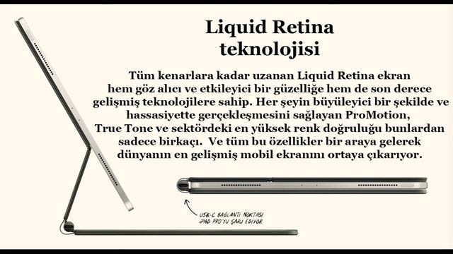 iPad Pro 12.9" Tablet Özellikleri Dahili Hafıza : 1 TB İşlemci Core : 8 Core İşletim Sistemi: iOS Versiyonu : iOS 13 Seri : iPad Pro Wi-Fi : Var GPS : Var Bluetooth : Var Ön Kamera : Var Arka Kamera : Var Sim Kartlı : Var Bellek : 6 GB RAM Ekran Boyutu : 12.9" İnc Çözünürlük : 2732 x 2048 Piksel İşlemci Türü : Apple A12Z İşlemci Bilgisayar Performansı İsteyenlere Güçlü sistem özellikleri ve ergonomik tasarımı ile birlikte yanında her zaman bilgisayar taşımak isteyenlere hitap eden bu özel tablet, günlük işlemlerden çok daha yüksek performans gerektiren işlemlere kadar her zaman en iyi değerlerin oluşmasını sağlamaktadır. Gelişmiş Ekran Özellikleri ProMotion ve True Tone özellikleri ile birlikte gerçekçi görüntü kalitesine sahip olan ürün, tüm işlemlerde, özellikle grafik tasarım işlemlerinde en iyi sonuçların ve değerlerin alınmasını sağlıyor. Özel retinası tüm renklerde ve görünümlerde gerçeğin kendisini yansıtıyor. Her Zaman Hızlı Tüm işlemlerinizde yüksek hızlara en iyi şekilde ulaşmanız için geliştirilmiş güçlü yapısı hem günlük işlerinizi yapabilmenizi sağlıyor, hem de oyun oynama keyfini daha fazla arttırıyor. Tüm işlemlerinizde kesintisiz ve herhangi bir takılma olmadan sunulan hızlar, zamanınızı daha iyi kullanmanıza imkân veriyor. Anları Ölümsüz Kılmak İsteyenlere Hiçbir anı kaçırmak istemediğinizde, büyüleyici güzelliğe sahip geniş açılı fotoğraflar çekmenize olanak sağlayan gelişmiş çözünürlüğe sahip kamerasını kullanabilirsiniz. Lidar tarayıcı özelliği ile birlikte daha gerçekçi bir çekim yapabilmenizi sağladığı gibi fotoğraf ve videolarınızın ölümsüz olmasını sağlayabilirsiniz. Daha Kolay Kullanım Özel olarak geliştirilmiş trackpad özelliği sayesinde yazma işlemlerinizi çok daha ergonomik ve rahat bir şekilde yapabilmenize imkân verir. İmleçle çalışmanın en iyi yöntemi olan bu özellik ile birlikte işlemlerinizi tamamlamak daha kolay hale gelir. Ekranı Her Açıdan Kullanın Grafik çizimlerinizden belgeleriniz üzerinde notlar alabilmek için geniş bir alanda en iyi kullanım özelliklerini sunan hassas ekranı ve kalem uyumu böylece günlük yaşamınızı daha pratik bir hale getirebiliyor.