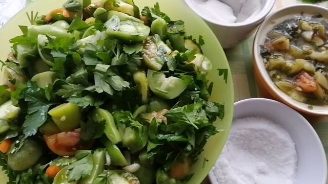 №24 Салат из зеленых помидор без варки и стерилизации. Салат "обжорка" из зеленых помидор .
