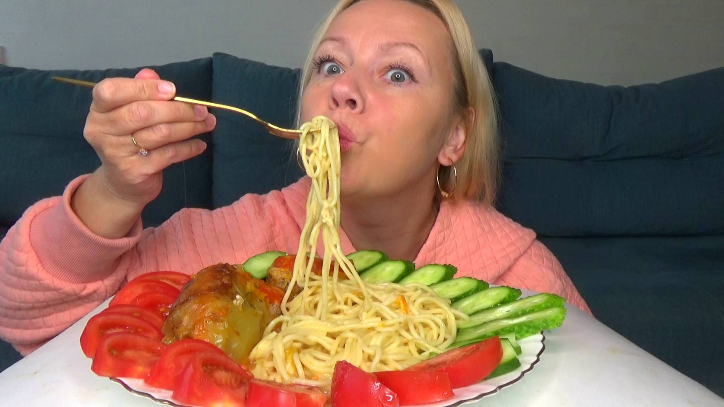 Мукбанг макароны, перец фаршированный запеченный ,овощи. Еда на камеру.