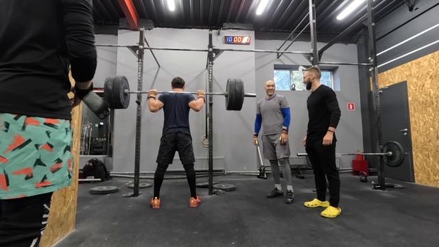 Техника 21ЕМОМ, чередуя 1 рывок в стойку 1 рывок с виса в сед 1 рывок в сед 65 (кг) 70 не пошло Сила Каждые 90 секунд, 15 минут 3-3-2-2-1 приседа со штангой на спине 3 строгих подтягивания как можно выше Если на прошлой неделе справились -добавляем к весу прошлой недели 5-10 кг, и стартуем. 105 (кг) 115 (кг) 125 (кг) Начал со 105 и до 125 пошел Комплекс 8 раундов 10 подносов ног 40 двойных Решаем как будем разбивать, и придерживаемся тактики, не спеша. или 40-30-20-10 подносов ног 100 двойных * 14:29 (время) Паша постоянно меня ждал