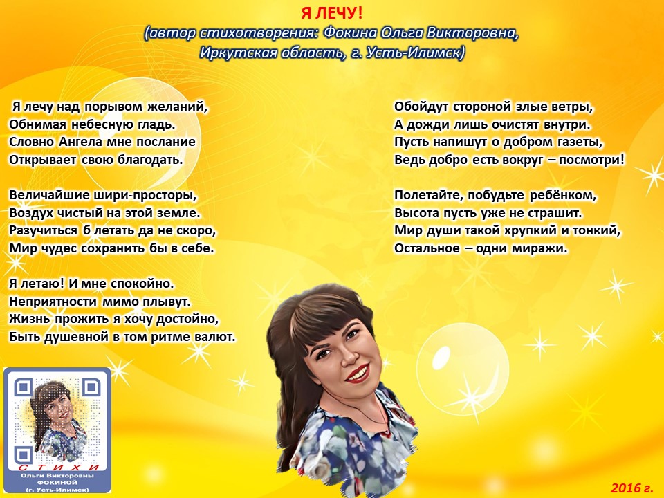 Читает автор стихотворения: ФОКИНА ОЛЬГА ВИКТОРОВНА (Иркутская область, город Усть-Илимск) СТИХИ: https://stihi.ru/2018/07/08/3790 БИОГРАФИЯ: http://www.proza.ru/2019/10/08/1473 ВЫИГРЫВАЙТЕ КНИГИ БЕСПЛАТНО: https://proza.ru/2017/09/17/447 ОТЗЫВЫ ЧИТАТЕЛЕЙ: http://www.proza.ru/2019/11/29/611 Из книги Фокиной Ольги Викторовны (Усть-Илимск) «Несу добро в ладошках!»: [все стихотворения с 2005 по октябрь 2020 гг., проза, авторские песни, интервью]. – Москва: МГО Союза писателей России, 2020 г. – 886 стр., ил. ISBN 978-5-7949-0826-8 Я ЛЕЧУ! (автор стихотворения: Фокина Ольга Викторовна, Иркутская область, г. Усть-Илимск) Я лечу над порывом желаний, Обнимая небесную гладь. Словно Ангела мне послание Открывает свою благодать. Величайшие шири-просторы, Воздух чистый на этой земле. Разучиться б летать да не скоро, Мир чудес сохранить бы в себе. Я летаю! И мне спокойно. Неприятности мимо плывут. Жизнь прожить я хочу достойно, Быть душевной в том ритме валют. Обойдут стороной злые ветры, А дожди лишь очистят внутри. Пусть напишут о добром газеты, Ведь добро есть вокруг – посмотри! Полетайте, побудьте ребёнком, Высота пусть уже не страшит. Мир души такой хрупкий и тонкий, Остальное – одни миражи. 13 июня 2016 г.