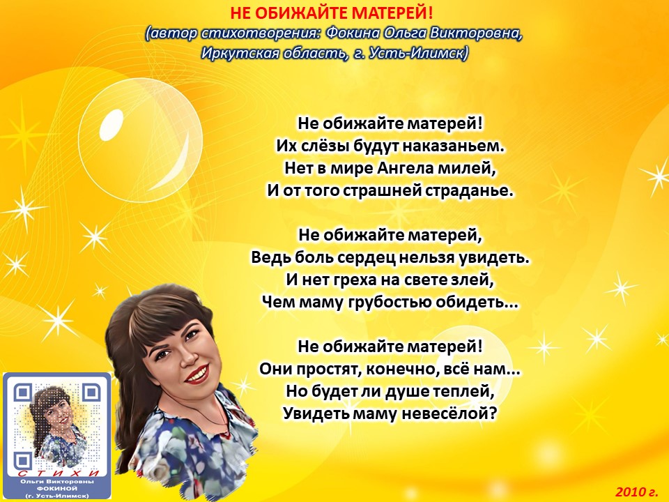 Читает автор стихотворения: ФОКИНА ОЛЬГА ВИКТОРОВНА (Иркутская область, город Усть-Илимск) СТИХИ: https://stihi.ru/2018/07/08/3790 БИОГРАФИЯ: http://www.proza.ru/2019/10/08/1473 ВЫИГРЫВАЙТЕ КНИГИ БЕСПЛАТНО: https://proza.ru/2017/09/17/447 ОТЗЫВЫ ЧИТАТЕЛЕЙ: http://www.proza.ru/2019/11/29/611 Из книги Фокиной Ольги Викторовны (Усть-Илимск) «Несу добро в ладошках!»: [все стихотворения с 2005 по октябрь 2020 гг., проза, авторские песни, интервью]. – Москва: МГО Союза писателей России, 2020 г. – 886 стр., ил. ISBN 978-5-7949-0826-8 НЕ ОБИЖАЙТЕ МАТЕРЕЙ! (автор стихотворения: Фокина Ольга Викторовна, Иркутская область, г. Усть-Илимск) Не обижайте матерей! Их слёзы будут наказаньем. Нет в мире Ангела милей, И от того страшней страданье. Не обижайте матерей, Ведь боль сердец нельзя увидеть. И нет греха на свете злей, Чем маму грубостью обидеть... Не обижайте матерей! Они простят, конечно, всё нам... Но будет ли душе теплей, Увидеть маму невесёлой? 26 сентября 2010 г.