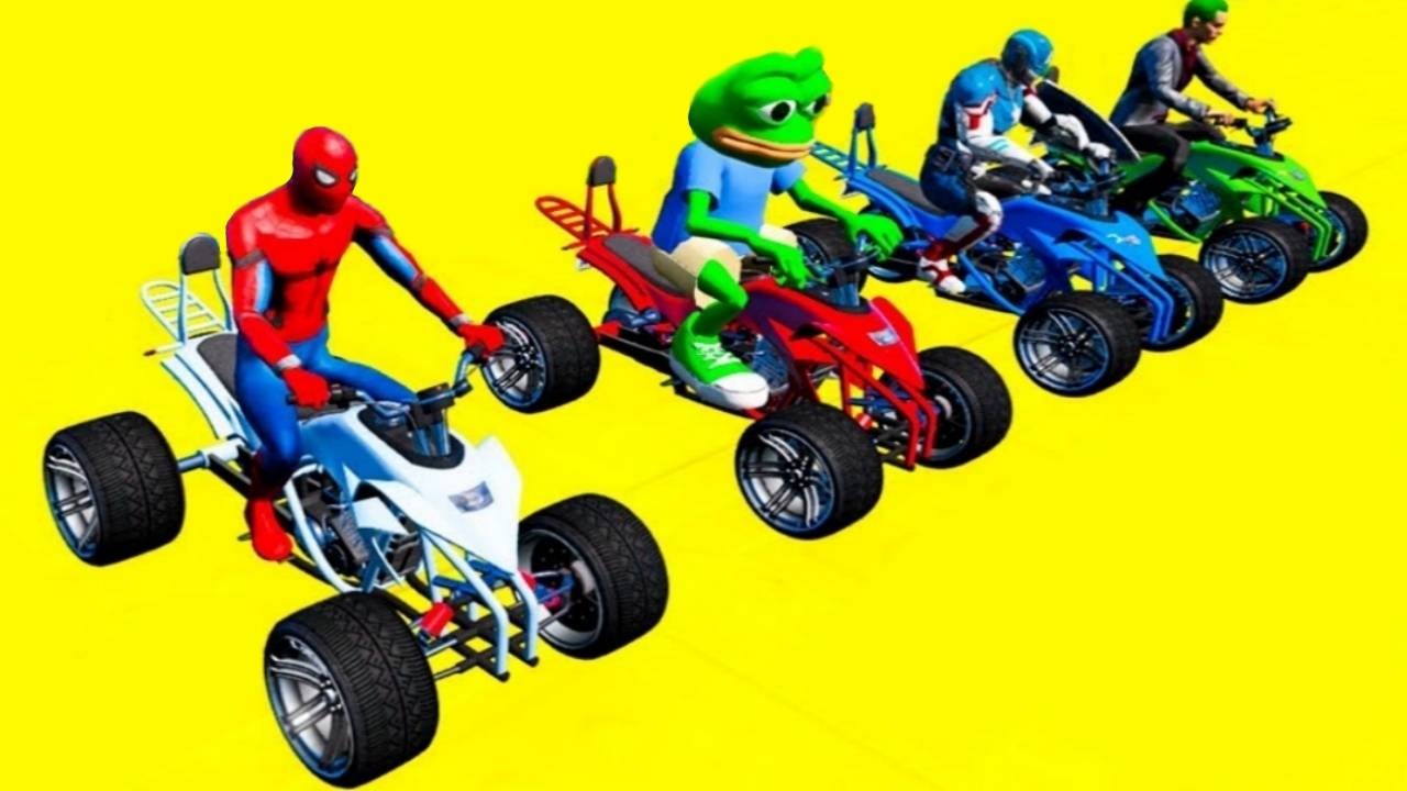 Супер гонки на квадроциклах с Человеком-пауком на морской рампе Гоночные мотоциклы супергерои