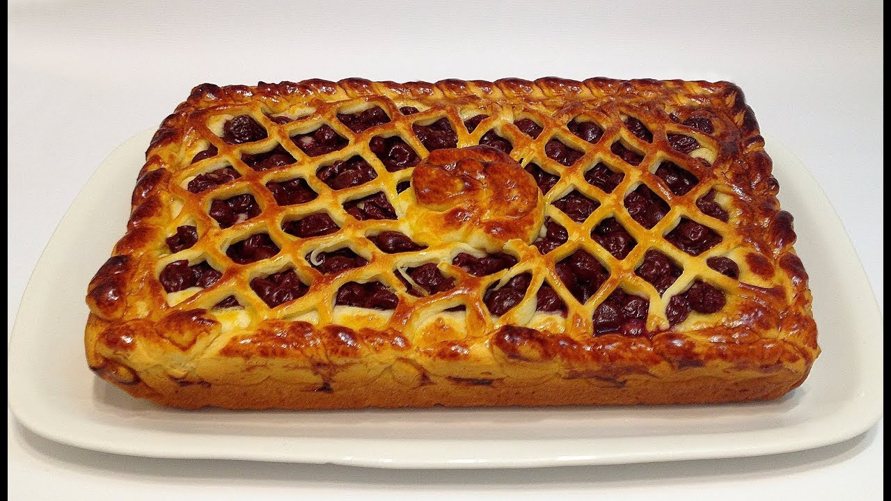 Рецепт теста: 1 стакан молока, 50 гр.дрожжей, 4 яйца,(один желток на смазку), 6 ст.ложек сахара, 50 гр.масла или маргарина, 0,5 ч.ложки соли, ванилин, 2 ст.ложки подс.масла, 800 гр.муки. Рецепт начинки: 1 кг.вишни без косточки, 1 стакан сахара(200 гр.), 3 ст.ложки крахмала (60 гр.). Размеры формы: 32 × 24 × 5 см.