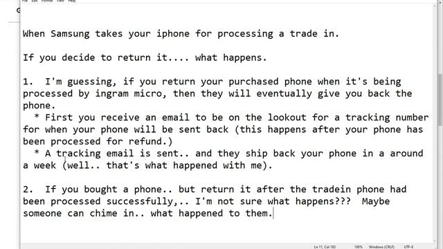 Disclaimer: Boring Video. In this video I describe what might happen if you decide to return your newly purchased phone if you had happened to do a trade in. In my case this is what happened: 1) I purchased a galaxy a71 from samsung . 2) A few days later I received the A71 and then received an email to start my trade in of my old phone so I wouldn't be charged trade in. 3) I sent my old phone and it was received in a few days. 4) A few days after that.. I decided to return the phone because there was a better deal on cyber monday. So.. what happened to my trade in phone? Do I lose the phone.. or will samsung return it? It depends.. But in my case I did get my trade in back. 5) So I returned my phone... 6) during this time.. my trade in phone was still in the processing and evaluation stage. 7) When I started the return, my trade in phone's status changed to deferred status. 8) When the purchased a71 phone was returned.. and I was eventually refunded... then I received an email stating that I would get my old trade-in phone back again and to look for an email with tracking number. End of my long story is.. I did get my trade in. As I mentioned,.. I believe this would have turned out possibly different if my old trade in was processed quickly. I believe in cases where I return the phone too late,.. there is a chance you might not get your trade in phone back from samsung (as I read in the small print). Good luck.. let me know if you did a trade in for your new purchase of a samsung from samsung's website and if you got back your trade in.