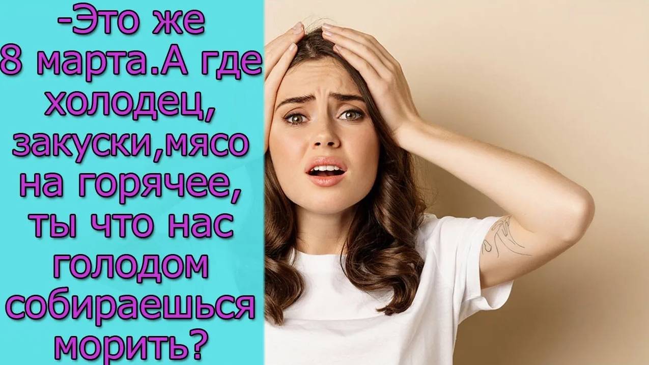 - Это же 8 марта. А где холодец, закуски, мясо на горячее, ты что нас голодом собираешься морить_