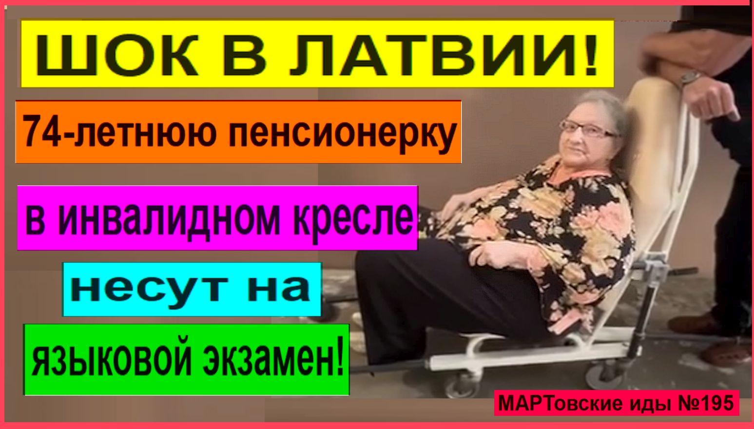 "ШОК В ЛАТВИИ! 74-летнюю пенсионерку, гражданку РФ в инвалидном кресле несут на языковой экзамен". Это новость вызвала огромный общественный резонанс. Проблема в том, что парламент Латвии вдруг аннулировал все виды на жительство у граждан России, проживающих в этой центральной республике Прибалтики. Чтобы возобновить вид на жительство, нужно до 1 сентября сдать экзамен по латышскому языка. Иначе депортируют. Возмутились даже латышские политики и комментаторы. См. видео в рамках постоянной новостной рубрики "МАРТовские иды №195". Ждём комментарии!