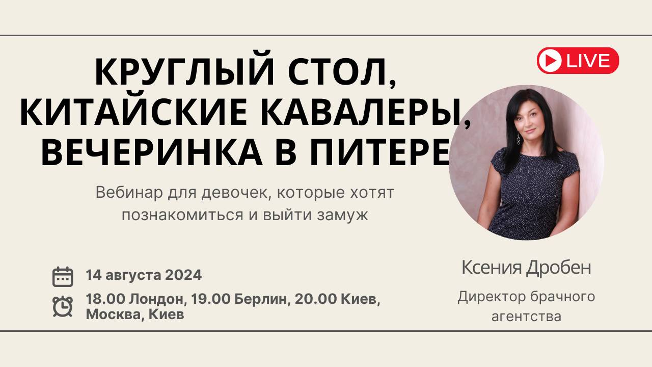 После моей китайской паузы мы возврашаемся к нашей рутине – и сегодня у нас традиционный девочкин вебинар. Я поделюсь с вами результатами последнего Круглого стола и расскажу несколько актуальных историй. Так же расскажу о том, что происходит с вечеринкой знакомств в Питере 23-25 августа. Время встречи: среда 14 августа – 18.00 по Лондону, 19.00 по Берлину, 20.00 по Москве, Киеву и Минску Место встречи: RuTube - https://rutube.ru/channel/24748934/ YouTube Ksenia Droben https://www.youtube.com/@KseniaDrobenPartnervermittlung Страница Facebook https://www.facebook.com/ksenia.droben Группа Facebook https://www.facebook.com/groups/datingmarriageagency VK https://vk.com/kseniadroben Instagram https://www.instagram.com/kseniadroben/ - @kseniadroben Tiktok: @kseniadrobendating Telegram - https://t.me/+1r3gxV3q1gIxMjRi С уважением Дробен Ксения www.droben-partnervermittlung.de Whatsapp +49 1520 3663653