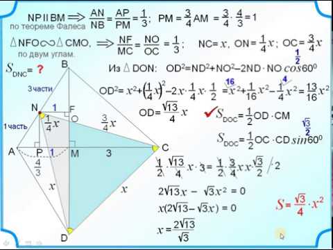 Диагонали ВD и АС выпуклого четырехугольника АВСD перпендикулярны, пересекаются в точке М, АМ = 4/3, МС = 3. Точка N лежит на стороне АВ, причем AN : NB = 1 : 3. Треугольник DNC – равносторонний. Найдите его площадь.