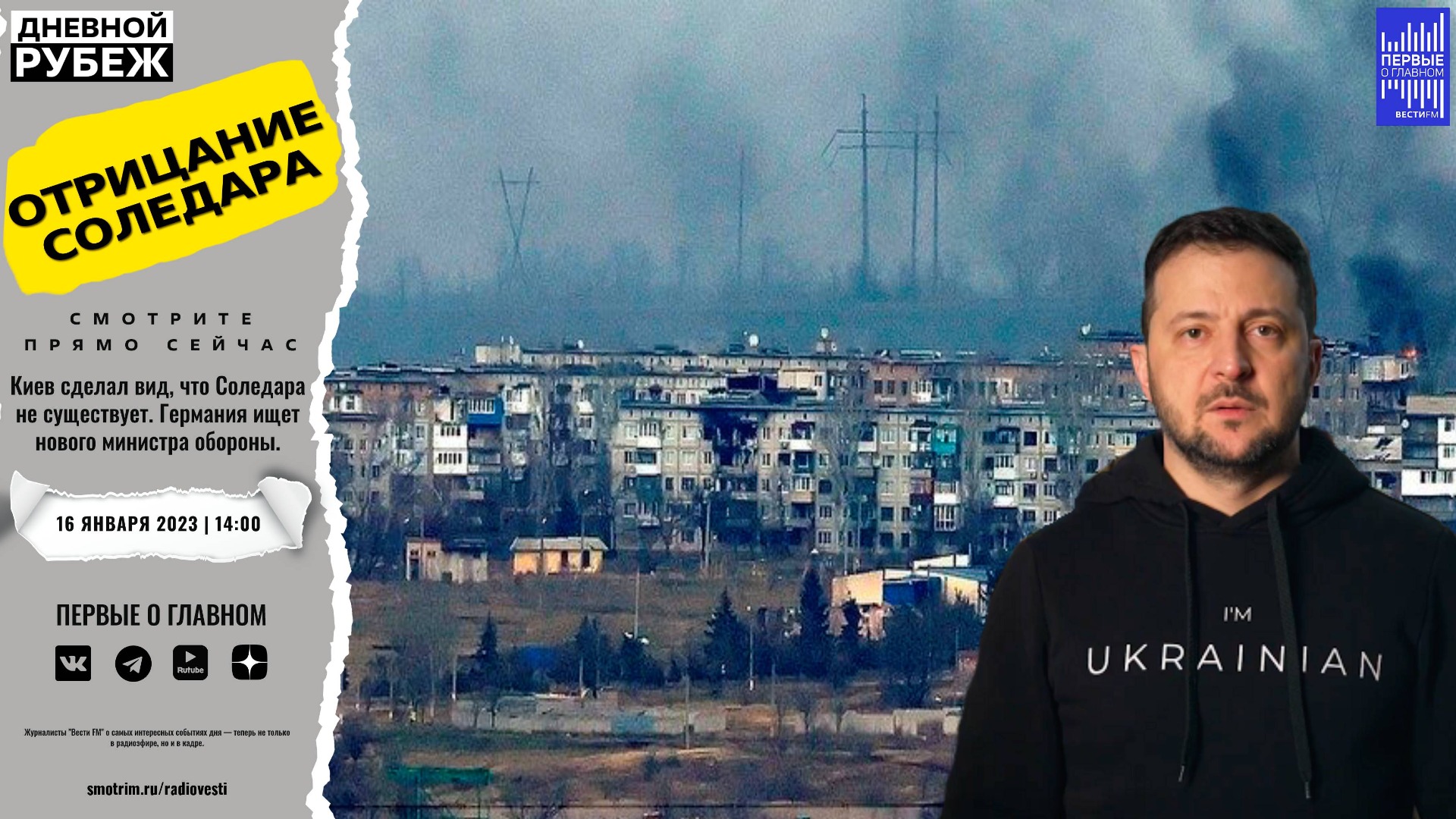 #дневнойрубеж #первыеоглавном #вестифм #соледар #донецк #сво #спецоперация #всу #украина #обстрелы #медведчук #вкусноиточка #макдоналдс #конкурскрасоты #пленные #беженцы #протесты #германия #хегль #сша #европа #белов Киев сделал вид, что Соледара не существует. Германия ищет нового министра обороны. ?Подписывайтесь на Telegram канал - Первые о главном: https://t.me/vestifmfirst ?Подписывайтесь на Rutube канал - Первые о главном: https://rutube.ru/channel/24115140/ ?Подписывайтесь на VK канал - Первые о главном: https://vk.com/first.vestifm ?Подписывайтесь на ДЗЕН канал - Первые о главном: https://zen.yandex.ru/id/5fc4960a799d1b24b5be5189 ?Подписывайтесь на Telegram канал - ВестиFM+: https://t.me/s/vestifmplus