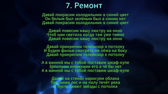 Давай покрасим холодильник в синий цвет Он белым был зелёным был а синим нет Давай покрасим холодильник в синий цвет Давай повесим нашу люстру на окно Чтоб нам светила когда там уже темно Давай повесим нашу люстру на окно Давай прикрепим телевизор к потолку И будем фильм смотреть не лёжа на боку Давай прикрепим телевизор к потолку А в ванной мы с тобой поставим шкаф-купе Заполним книжками его а чё бы нет А в ванной мы с тобой поставим шкаф-купе Давай на стенах нарисуем облака Под ними лес и на полу течёт река И пусть сияют звёзды с потолка
