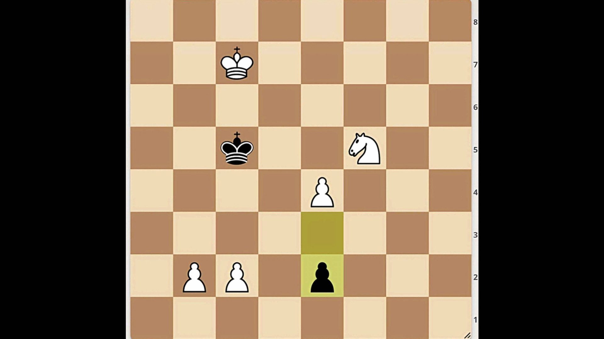 Красивая шахматная задача. Выигрышная позиция. Найдите лучшее продолжение за белых. Белые начинают и выигрывают. A beautiful chess problem. Winning position. Find the best continuation for White. White to move and win. [Event "casual correspondence game"] [Site "https://lichess.org/XPA11JNU"] [Date "2025.10.15"] [White "lichess AI level 8"] [Black "_"] [Result "1-0"] [GameId "XPA11JNU"] [UTCDate "2025.10.15"] [UTCTime "18:33:38"] [WhiteElo "?"] [BlackElo "1500"] [Variant "From Position"] [TimeControl "-"] [ECO "?"] [Opening "?"] [Termination "Normal"] [FEN "8/2K5/8/2k2N2/4P3/8/1PP1p3/8 w - - 0 1"] [SetUp "1"] [Annotator "lichess.org"] 1. c3 e1=Q 2. Nd6 Qxc3 3. Nb7+ Kd4+ 4. bxc3+ Kxe4 5. c4 Kd4 6. c5 Kd5 7. Kd7 Ke5 8. c6 Kd5 9. Kc7 Ke6 10. Nc5+ Ke7 11. Kb6 Ke8 12. c7 Ke7 13. c8=Q Kd6 14. Qe6# { White wins by checkmate. } 1-0