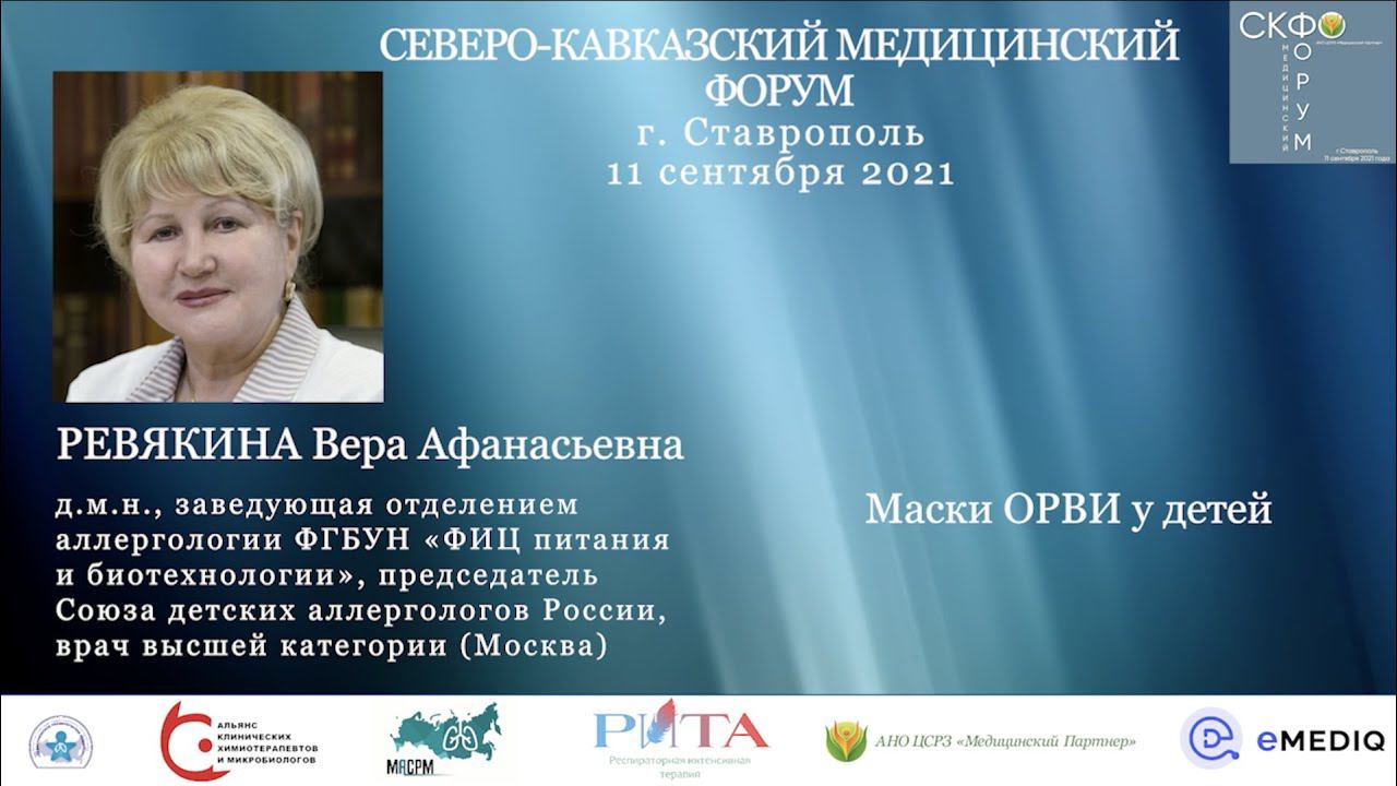 Вера Афанасьевна Ревякина д.м.н., профессор, заведующая отделением аллергологии ФГБУ «Научно-исследовательский институт питания», председатель Союза детских аллергологов России Тема лекции: "Маски ОРВИ у детей" Медицинский Форум СКФО, 11 сентября 2021г., г.Ставрополь