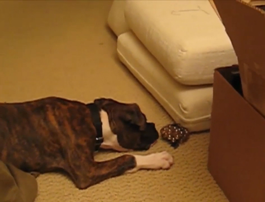 Щенок боксёра растерян – ему достался мешок стеклянных шариков-марблов, но совершенно непонятно, что с ним делать.