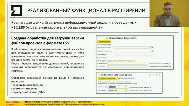 Lоклад руководителя отдела внедрения девелоперской компании Первостроитель о том, как компания поэтапно переходила на технологию информационного моделирования (ТИМ), где и как искала выгоды и повышение рентабельности, о внедрении BIM функций сметной подсистемы "1C:ERP Управление строительной организацией 2". Проект, реализованный совместно специалистами компаний "Уральский ТИМ центр" и "Эрикос-ЦСП" получил в 2023 году почетный титул "1С:Проект года". Егор в докладе также уделил некоторое время и рассказу о ходе проекта Минстроя Свердловской области об осмечивании информационной модели.