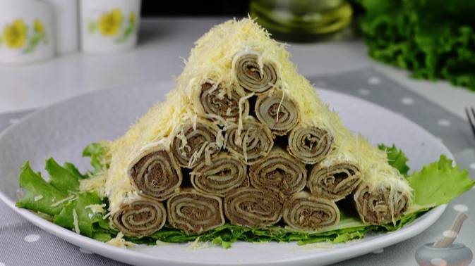 Блинный торт «Монастырская изба» с печенью - это оригинальная и сытная закуска для праздничного стола. Нежные тонкие блины сворачивают с печёночной начинкой в рулетики, выкладывают горкой и смазывают майонезом. Эффектно и вкусно.