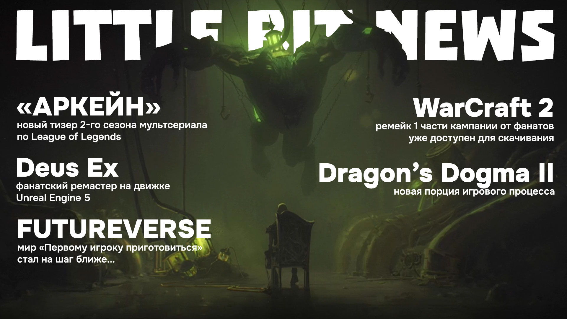 Подборка интересных новостей за прошедшие сутки. Без назойливых шуток, косплея, скандалов, интриг, хайпа и вот этого всего. Только игры и вы... поехали! („• ֊ •„)/ Сегодня в выпуске Little Bit News: Фанатский ремейк Warcraft 2, новый тизер «Аркейн», мир «Первому игроку приготовиться» стал ближе Контакты: Пикабу: https://pikabu.ru/@Little.Bit Boosty: https://boosty.to/littlebitboosty ВК: https://vk.com/little_bit_group Twitch: https://www.twitch.tv/littlebit_twitch Telegram: https://t.me/little_bit_games