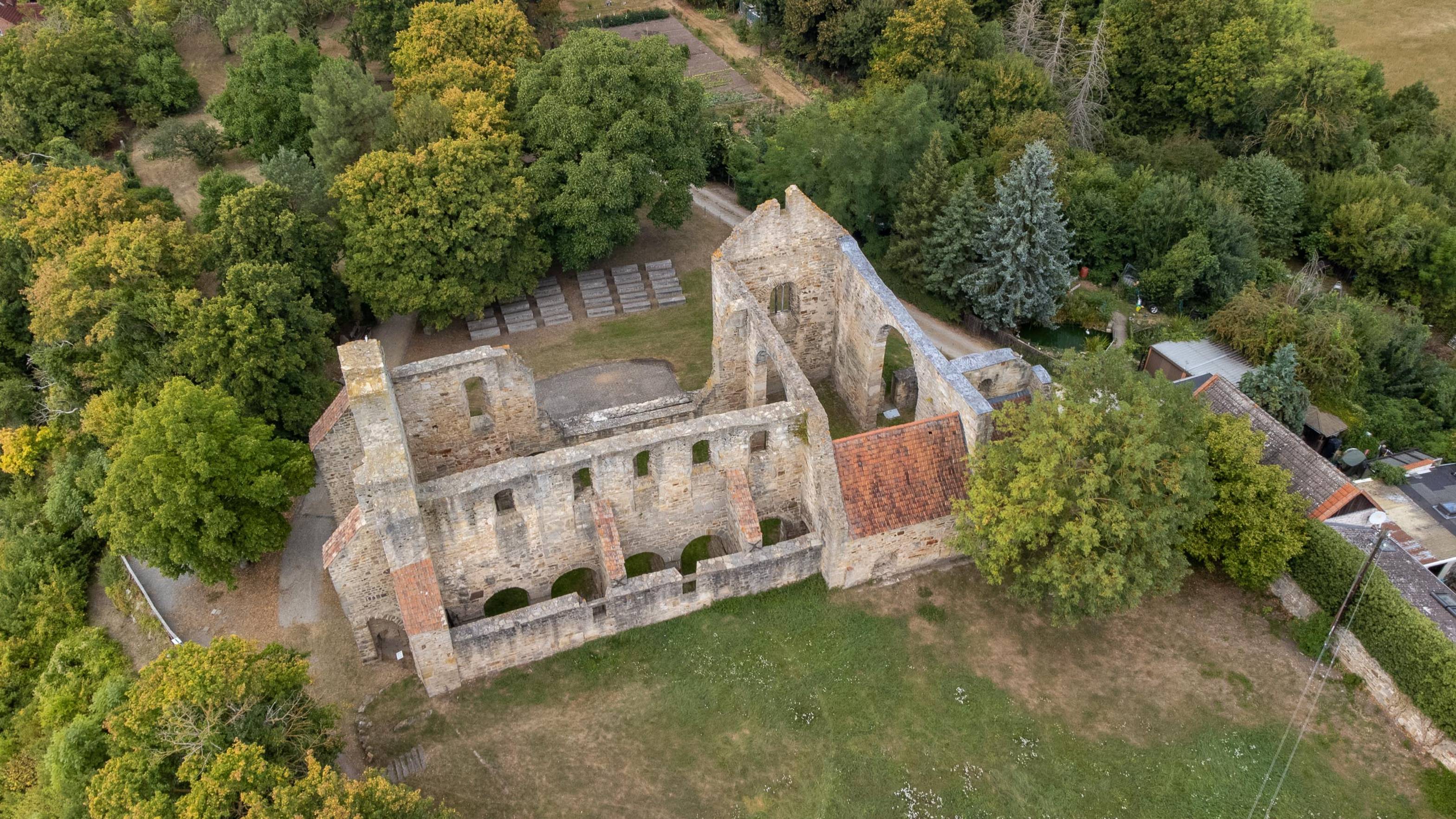 Руины монастыря Вальбек недалеко от бывшей границы между ГДР и ФРГ. Монастырь Вальбек был основан в 942 году н. э. графом Лотаром II. Церковь была построена около 942–950 годов н. э., первоначально в раннероманском стиле. Церковь неоднократно ремонтировалась и расширялась. В XVI веке северная стена трансепта была отреставрирована, когда комплекс стал протестантским монастырём. После упразднения монастыря церковь начала разрушаться. После того, как в 1829 году были снесены крыши боковых нефов, церковь была передана общине Вальбека в качестве богадельни.
