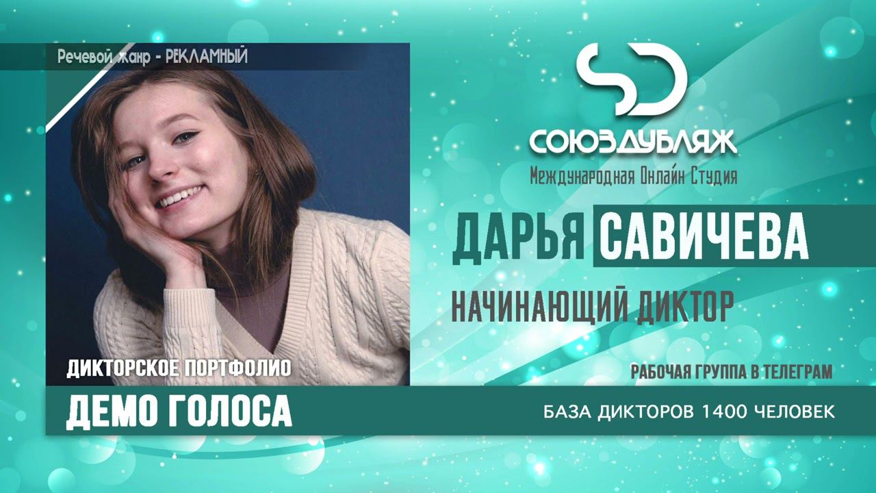#СоюзДубляж #БазаДикторов #Озвучка ✔️Дарья Савичева, начинающий диктор озвучивания. Международная Онлайн-Студия "СОЮЗДУБЛЯЖ" - профессиональная озвучка и дубляж. ▪️Рабочая группа в Телеграм: https://t.me/soyuzdubliazh ▪️Контакт для связи: https://t.me/SoyuzAdmin ▪️Подпишись:https://www.youtube.com/c/SOYUZDUBLIAZH ▪️Сайт: https://www.soyuzdubliazh.com/ Лучшие голоса для вашей аудиорекламы и видеороликов. База дикторов - 5 000 человек, профессионального уровня на ENG| FR| TR| RU| ISR| AZ| UA| KZ| UZ| языках. Мужские и Женские топовые голоса для озвучки любых проектов, таких как: Рекламы, Презентации, Фильмы, Сериалы, Игры, Мультфильмы, ТВ Шоу, Аудио-видео визитки. ✔️Сотрудничая с нами вы получаете свой проект под ключ, не выходя из дома или офиса. Наша слаженная команда из лучших дикторов, актёров озвучивания, режиссёров и звукорежиссёров в кратчайшие сроки озвучат или отдублируют ваш заказ на профессиональном уровне. Образцы работ нашего портфолио вы сможете посмотреть на канале СОЮЗДУБЛЯЖ. ВНИМАНИЕ: ✔️Мы приглашаем специалистов озвучки к сотрудничеству в нашей команде. Вы можете пройти по ссылке в наш телеграм канал и связаться с Админом для обсуждения. ✔️Всем заказчикам подобных медиа проектов по озвучки и дубляжу фильмов, сериалов, документалок обращаться непосредственно к Админу Телеграм группы СОЮЗДУБЛЯЖ, пройдя по ссылке: Проходи по ссылке: https://t.me/soyuzdubliazh International Online-Studio SOYUZDUDLIAZH presents a highly professional approach in voice-over and dubbing. ▪️Our working group https://t.me/soyuzdubliazh ▪️Chief manager https://t.me/SoyuzAdmin ▪️Follow https://www.youtube.com/c/SOYUZDUDLIAZH ▪️Web: https://www.soyuzdubliazh.com/ We offer You the best Voices for your Audio commercials and Video`s. Our Database contains over 5 000 voices of native speakers and high-class foreign language specialists in ENG| FR| TR| RU| ISR| AZ| UA| KZ| UZ|. Male & Female top level voices for all the variety of dubbing projects such as commercials, presentations, movies, TV-series, video and computer games, cartoons, TV-shows, audio & video portfolio’s – all in one place. As your business partner we guarantee a turn-key project without you leaving your house or office. Our target is to make sure that the dubbing of your project is made as quick as possible by a well-coordinated and professional team of the best speakers, film and sound directors. To whom it may concern! We invite dubbing specialists to join our team. Please contact our manager on Telegram https://t.me/soyuzdubliazh