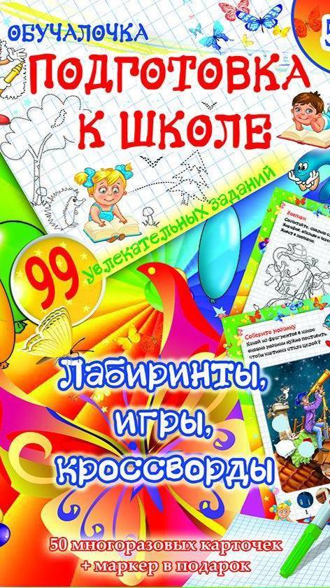 https://roossa.ru/knigi/obuchalochka-podgotovka-k-shkole-labirinty-igry-krossvordy-50-kartochek/ В комплект "Обучалочка. Подготовка к школе. Лабиринты, игры, кроссворды" для развития ребенка входят: 1. Фломастер, который стирается пальцем и не оставляет следов от чернил. 2. 50 двусторонних карточек с веселыми лабиринтами, забавными кроссвордами и занимательными играми. Обучающие задания разовьют детям логическое мышление, память, внимание и воображение, помогут освоить арифметику и чтение. Карточки можно использовать многократно: если ошибешься, просто сотри написанное фломастером и выполни задание еще раз, и так до тех пор пока не сделаешь на отлично! Рекомендуем "Обучалочку": для занятий с детьми от 5 лет; но некоторые задания могут выполнять и трехлетние малыши. Занимайтесь: с одним ребенком или устраивайте групповые уроки; дома, в парке, в гостях, в путешествии. Используйте для выполнения заданий: фломастер, который идет в комплекте с карточками; или любой другой фломастер на водной основе. Увлекательные задания помогут детям с 4 лет легко подготовиться к школе.