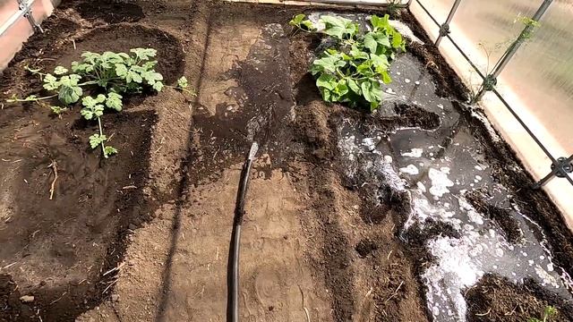 Поливаю в теплицах арбузы, дыни и клубнику на участке наполнением грядок 14 июня
