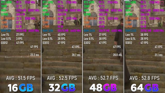 RAM : 16GB vs 32GB vs 48GB vs 64GB | 4K Buy games at the best prices on gamivo.com - https://gvo.deals/TestingGames Use coupon code and get discount - TG3 Games : God of War Ragnarok - 0:06 S.T.A.L.K.E.R. 2 - 1:04 CYBERPUNK 2077 - 2:18 Hogwarts Legacy - 3:20 Star Wars Outlaws - 4:26 Black Myth Wukong - 5:21 Dragon Age The Veilguard - 6:32 SILENT HILL 2 - 7:36 System: Windows 11 Ryzen 7 7800X3D - http://bit.ly/43e3VxW MSI MPG X670E CARBON - https://bit.ly/3YWS871 RAM 16\32\48\64GB DDR5 6400MHz CL32 - https://bit.ly/4e3MqEG CPU Cooler - be quiet! DARK ROCK 5 - https://bit.ly/3AnAOin GeForce RTX 4090 24GB - https://bit.ly/3CSaMCj SSD - 2xSAMSUNG 970 EVO M.2 2280 1TB - https://bit.ly/2NmWeQe Power Supply CORSAIR HX Series HX1200 1200W - https://bit.ly/3EZWtNj Теги: How Much RAM Do You Need,RAM,16GB vs 32GB,32GB vs 48GB,48GB vs 64GB,32GB vs 64GB,16GB vs 64GB,16gb ram in 2025,32gb ram,48gb ram,64gb ram,ram gaming,pc memory,ram for gaming,stalker 2,Hogwarts Legacy,gaming,fps,test