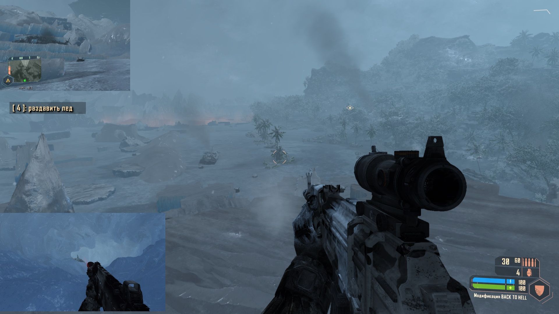 Решил переделать Back to hell episode one в классическом стиле и с нотками альфы (наверное,переделал текстуры объектов из warhead в классическом стиле) Получилось не менее красиво..,ледяные кубы там не менее цветастые по сравнению с ним же в стиле warhead Кстати сам уровень а именно его левую часть я бы переделал,так как она огороженная ледяными кубами и замерзшими волнами ,выглядит так себе.особенно в том мете нде разрушен мост и его левая часть ?крайняя ) находится посреди льда ,что странно Наверное трудно найти адекватный перевод для фраз break ice & alien overload ...но самые близкие это Протереть стекло маски и имитатор сигнал пришельцев ?а не Расколоть лёд и Перегрузка пришельцев.. e Кстати окраска замороженной воды в crysis warhead такая же ,как у воды в Байкала ,жа и вообще может Crysis Warhead и не такой цветастый и яркий как некоторыми кажется.. Кто бы воссоздал альфу crysis и показал бы всё её красоту...