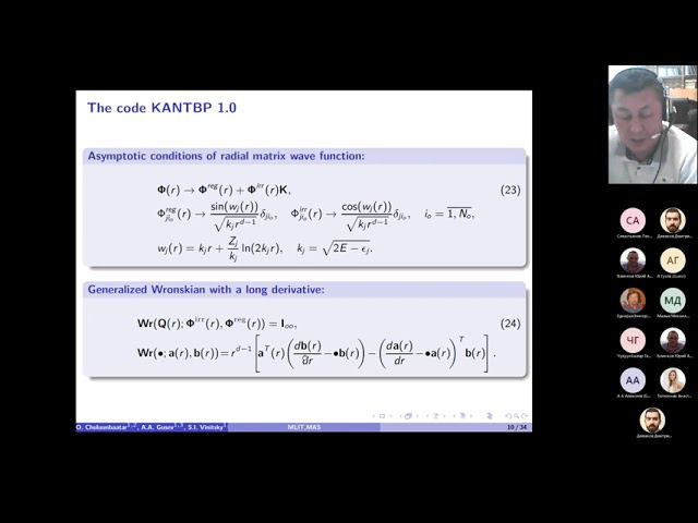 https://events.rudn.ru/event/183/ Обновления программы KANTBP и их применение для решения некоторых физических проблем О. Чулуунбаатар Монгольская академия наук, Улан-Батор, 13330, Монголия в сотрудничестве с А.А. Гусев, С.И. Виницкий Объединенный институт ядерных исследований, Дубна, Московская область, 141980, Россия Государственный университет «Дубна», Дубна, Московская область, 141980, Россия Российский университет дружбы народов (РУДН), 117198 Москва, Россия Первая FORTRAN версия программы KANTBP для вычисления значений энергии, матриц отражения и прохождения (или матрицы реакции) и соответствующих волновых функций в приближении связанных каналов адиабатического подхода была опубликована в Computer Physics Communications в 2007 году. При таком подходе многомерное уравнение Шредингера сводится к системе связанных обыкновенных дифференциальных уравнений второго порядка на конечном интервале с однородными краевыми условиями третьего рода в левой и правой граничных точках для задач дискретного спектра и многоканального рассеяния. Соответствующие краевые задачи решаются методом конечных элементов с использованием аппроксимаций высокого порядка точности. В течение 15 лет программа KANTBP обновлялась в трех FORTRAN версиях и двух MAPLE версиях. Эти версии применялись и применяются для решения различных задач в атомной, молекулярной и ядерной физике. Updates to the KANTBP program and their applications to solve some physical problems O. Chuluunbaatar Mongolian Academy of Sciences, Ulaanbaatar, 13330, Mongolia in collaboration with A.A. Gusev, S.I. Vinitsky Joint Institute for Nuclear Research, Dubna, Moscow Region, 141980, Russia Dubna State University, Dubna, Moscow Region, 141980, Russia Peoples' Friendship University of Russia (RUDN University), 117198 Moscow, Russia The first FORTRAN version of the KANTBP program to calculate the energy values, reflection and transmission matrices (or reaction matrix) and the corresponding wave functions in the coupled channel approximation of the adiabatic approach was published in Computer Physics Communications in 2007. In this approach, the multidimensional Schrödinger equation is reduced to a system of coupled second-order ordinary differential equations on a finite interval with the homogeneous boundary conditions of the third type at the left- and right-boundary points for discrete spectrum and multichannel scattering problems. The corresponding boundary-value problems are solved by the finite element method using high-order accuracy approximations. Within 15 years, the KANTBP program has been updated in three FORTRAN versions and two MAPLE versions. The versions have been and are applied to solve various problems in atomic, molecular and nuclear physics. Ссылки на программы – Links to programs: KANTBP 1.0 – http://elsevier.digitalcommonsdata.com/datasets/2gcb9tjknz/1 KANTBP 2.0 – https://elsevier.digitalcommonsdata.com/datasets/stxc75v54w/1 KANTBP 3.0 – https://elsevier.digitalcommonsdata.com/datasets/7rdv5h3tns/1 KANTBP 3.1 – https://data.mendeley.com/datasets/4vm9fhyvh3/1 KANTBP 4M – http://wwwinfo.jinr.ru/programs/jinrlib/kantbp4m/indexe.html KANTBP 5M – https://link.springer.com/chapter/10.1007/978-3-030-81698-8_11