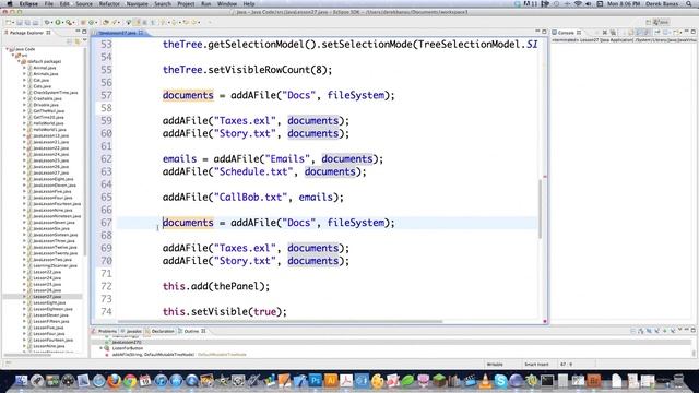 Get the Code: http://goo.gl/LF15W In this part of the Java Video Tutorial, I introduce the last Swing component called the JTree. I won't just be introducing the JTree however. I will also be reviewing much of what you have learned. It is my belief that if you see tools being used in many different ways, that you will just remember them. I will review dimensions, frames, panels, buttons, scroll bars, listeners and so much more.