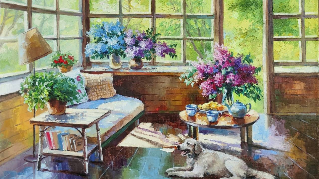 "Здравствуйте! Меня зовут Любовь Журавлёва. Я живу в Рязани. Работаю свободным художником. Любимые сюжеты: натюрморты с цветами, пейзажи, животные. Ещё пишу мастихином в стиле импрессионизм. В этом стиле выполняю серию "На террасе." Живописью занимаюсь уже более 20 лет. За этот срок появилось более 1000 картин, большая часть находится в частных коллекциях." ******************************* Сегодня знакомимся с живописью современного художника Любови Журавлёвой (1981 г). Её картины настолько яркие и солнечные, что даже в самый мрачный пасмурный день на душе станет светлее при взгляде на эти полотна, настолько они уютные, нежные, утончённые. Художница особое внимание уделяет написанию деталей, которые придают её картинам неповторимую особенность. Вот милая вязаная скатерть на круглом столе, цветущие герани в горшочках, подушечки с вышивкой и обязательно - собачка или котик-мурлыка, тоже как символ уюта и тепла... ______________________ Музыкальное сопровождение: Егор Денисевич, "Ожидание счастья".
