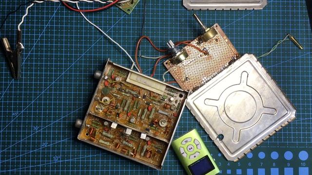 Простой радиопередатчик из блока телевизора СК-М-24-2. Ссылка на статью: http://www.433175.ru/index.php?newsid=4089 http://cxema.my1.ru/publ/razdel_skhem_dlja_nachinajushhikh_radioljubitelej/konstrukcii_prostoj_slozhnosti/prostoj_radioperedatchik_iz_bloka_sk_m_24_2/23-1-0-3385 Работая со школьниками уже много лет, не понаслышке знаю о том, что почти каждый школьник мечтает о связи. И мобилка здесь как раз не причем. Другое дело, что современных конструкций для новичков много. Правда, нужно признать, что они как раз и не для новичков. А время 6П3С уже ушло. Так как удовлетворить голод на простые передатчики? Думаю, нет необходимости говорить, что советы купить айком или даже UW3DI абсурден. Для двенадцатилетнего подростка этот вариант никто рассматривать не будет (разве что папа - радиолюбитель что-то предпримет). В литературе можно найти множество схем радиомикрофонов. Но только человек несведущий может подумать, что они могут работать. Нестабильность частоты, внешние наводки, случайное питание сводят на нет простоту схемы и... разочарование подчас на всю жизнь. Для того, чтобы все-же удовлетворить интерес на передатчики - игрушки, работающие на расстояние в несколько десятков метров (а других требований ребята, как правило и не ставят) и была разработана несложная конструкция выходного дня - передатчик "Регата", лауреат нескольких выставок творчества радиолюбителей - конструкторов Мариуполя. В качестве задающего генератора передатчика использован готовый узел стандартного телевизора – блок селектора метровых волн СК-М-24. Напомню, что селектор представляет собой преобразователь частоты каналов метровых волн, состоящий из двух поддиапазонов 1-5 и 6-12 телевизионных каналов. В данном передатчике использован первый из поддиапазонов (1-5 каналы). Спектр частот принимаемых сигналов составляет 48,5…100 МГц. Гетеродин блока при этом перекрывает диапазон частот на 38 МГц выше, т.е. 86,5 … 138 МГц. Таким образом, для получения частот FM диапазона 100 … 108 МГц достаточно использовать частоту гетеродина в качестве задающего генератора и передатчик готов. Для этого необходимы минимальные переделки. В схеме блока СК-М-24-2 транзистор VT5 выполняет функцию гетеродина данного поддиапазона, а смеситель VT3 требуется перевести в режим усиления сигнала гетеродина 100 … 108 МГц. Для этого в катушке L 21 требуется смотать лишние витки, оставив 8 витков из имеющихся 24-х. Для вывода сигнала генератора использован разъем блока «выход ПЧ», с включенным в разрыв дополнительным конденсатором С9 (рис. 1). Для перекрытия нужного участка 100 … 108 МГц на вывод 4 блока СК-М-24 (настройка) необходимо подать регулируемое напряжение в диапазоне примерно 5,5 … 8 V. На схеме рис. 1 для этой цели использован переменный резистор R8, а пределы регулировки частоты при необходимости можно скорректировать подбором резисторов R7 и R9. Для модуляции звуковым сигналом используется усилитель на транзисторе VT1, сигнал с которого через регулятор «Уровень» подмешивается в напряжение перестройки частоты (вывод 4 блоки СК-М-24). При использовании динамического микрофона можно обойтись и без микрофонного усилителя. Частотная модуляция получается за счет изменения емкости варикапа гетеродина под действием звукового сигнала. Микрофон подключается к выводам 1 и 2 XS1, а сигнал с магнитофона поступает с выводов 3 и 5 XS1 (вывод 2 остается общим) через делитель напряжения R1, R1-a, R5.