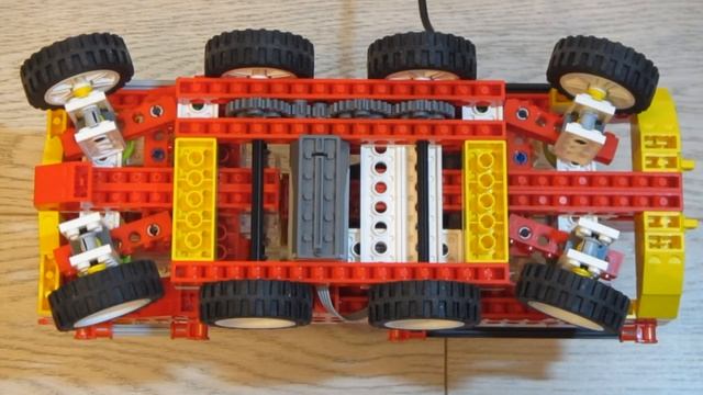 Модель 8-ми колесного тягача. Привод 8х4. Система рулевого управления: передние и задние поворотные колеса. Вращение руля в кабине при повороте колес. Использовано два М-мотора.