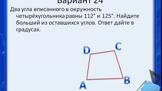 Площадь параллелограмма ABCD равна 145. Найдите площадь параллелограмма А'В'C'D', вершинами которого являются середины сторон данного параллелограмма. Два угла вписанного в окружность четырёхугольника равны 112° и 125°. Найдите больший из оставшихся углов. Ответ дайте в градусах.