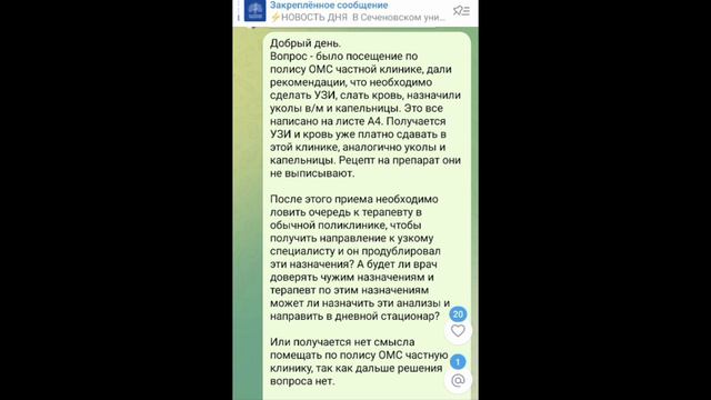 Всем добрый вечер. Полезная информация для жителей Подмосковья. Сейчас есть возможность посещать частные клиники по полису ОМС. У нас знакомые это сделали и возникло несколько вопросов. Мне стало интересно и я спросила у медицинского юриста в чате Мартынова. Он же владелец чатов Красногорск. Здоровье и все чаты Подмосковье. Здоровье. Ответы вы можете прочесть сами. Теперь по ответу по голосовому. Оказалось через бот в телеграмм можно легко перевести голосовое сообщение в текстовое и абсолютно бесплатно. По этой причине ознакомиться предлагаю вам самостоятельно. Какой можно сделать вывод - неверное гораздо удобнее изначально записаться к узкому специалисту в частную клинику по полису ОМС, но есть ряд неудобных факторов после. 1) Вам все равно придется отдельно после записаться к терапевту по месту жительства, чтобы вам бесплатно в рамках полиса ОМС было снова назначено уже в обычной поликлинике данное лечение. С чем это связано - стоимость одного укола в/м ( то есть в попу) - 600 рублей, одно в/в вливание - 1500 рублей ( капельница). Как правило уколов 5-10 , аналогично и капельниц. 2) Если вам назначают какой-то препарат в/в - например железо, то вам нет необходимости приобрести его самостоятельно - необходимо получить направление либо в дневной стационар, либо в больницу, где вам его в рамках полиса ОМС прокапают бесплатно и без приобретения вами этого лекарства. 3) Как я понимаю из ответов - для врача это все же рекомендации, а значит терапевт вам все равно не сможет назначить МРТ - следовательно все равно вам придется ждать очередь к узкому специалисту в вашей поликлинике. Заключение - если у вас есть возможность и время, то есть смысл посетить узкого специалиста в частной клинике по полису ОМС, но на мой субъективный взгляд после него все равно есть смысл пойти ещё к врачу уже в вашей поликлинике, чтобы разные врачи поставили один и тот же диагноз. Я не беру что-то простое, когда назначают только мазь и таблетки типа НПВС. И ещё - при подписании документов бланк не должен быть пустым...не стоит ставить вашу подпись без текста выше. P.S. сегодня ловили билеты по программе "День без турникетов". К сожалению не удачно, что хотелось не удалось выловить. Надеюсь у вас день прошел продуктивно. Всем здоровья. #2024 #россия #красногорск #здоровье #омс #инфориация